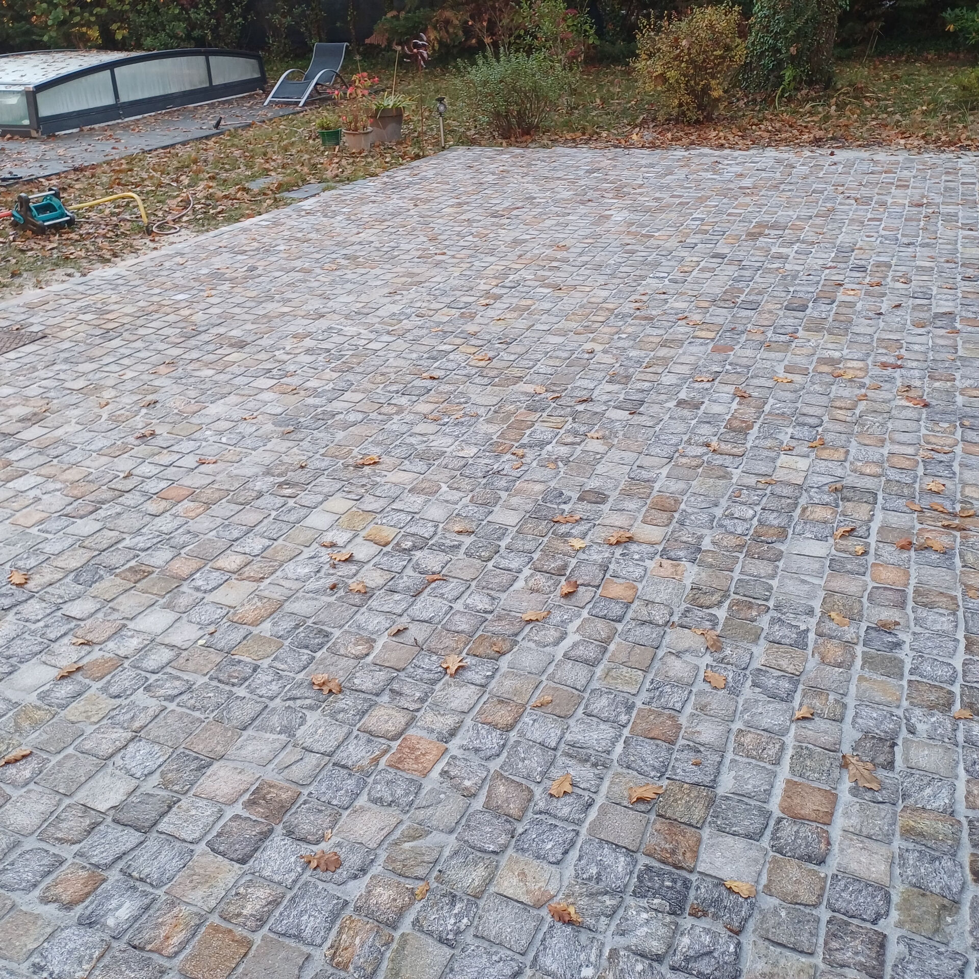 Vient ensuite la pose soignée de 78 m² de pavés de gneiss 8×10×5, calepinés avec précision pour un rendu homogène et durable.