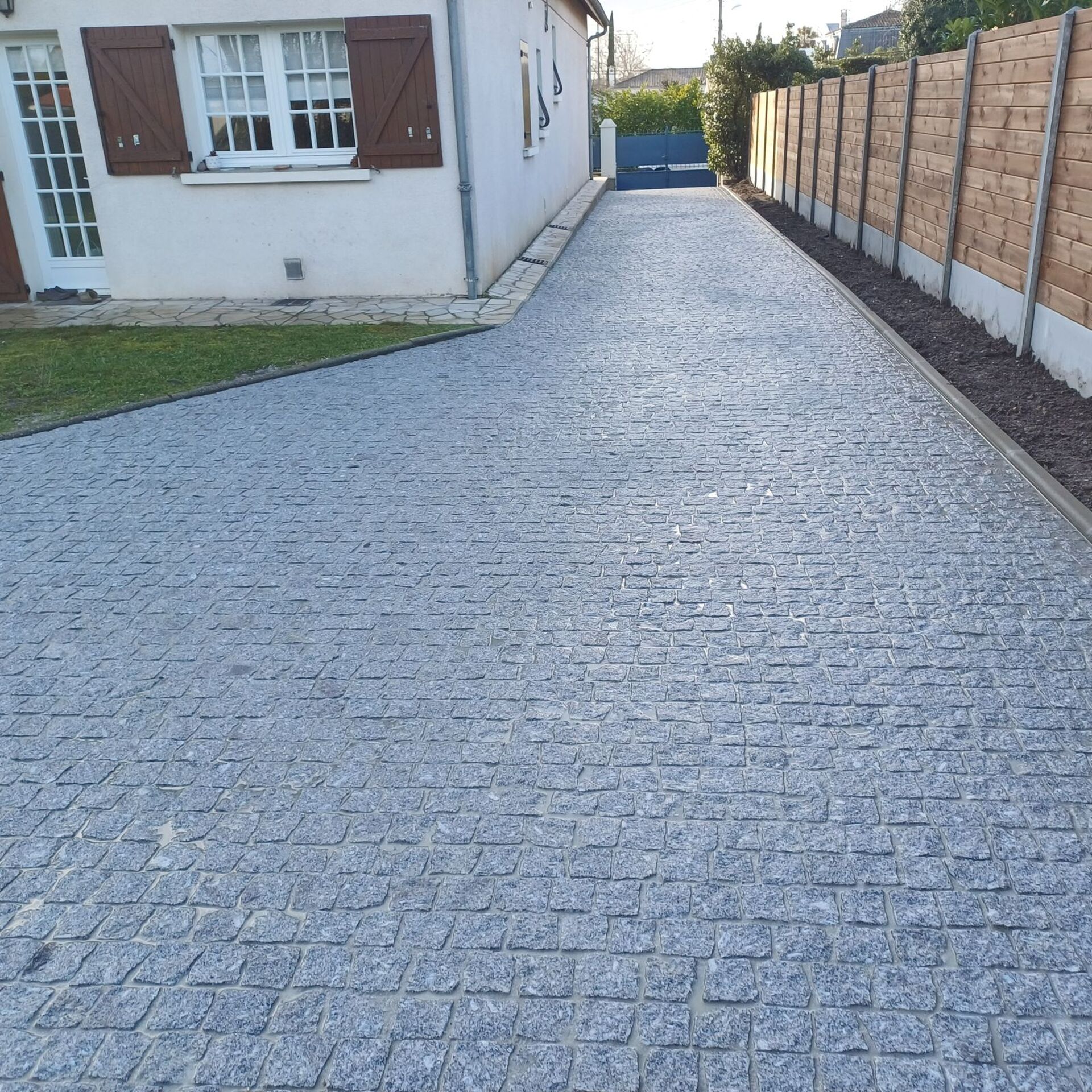 Pour ce projet d'aménagement extérieur réalisé sur la commune de Pessac, l'entreprise TTL33 a transformé l'accès d'une propriété privée en créant un chemin carrossable de 120m², alliant l'esthétique intemporelle de la pierre naturelle à une robustesse à toute épreuve.