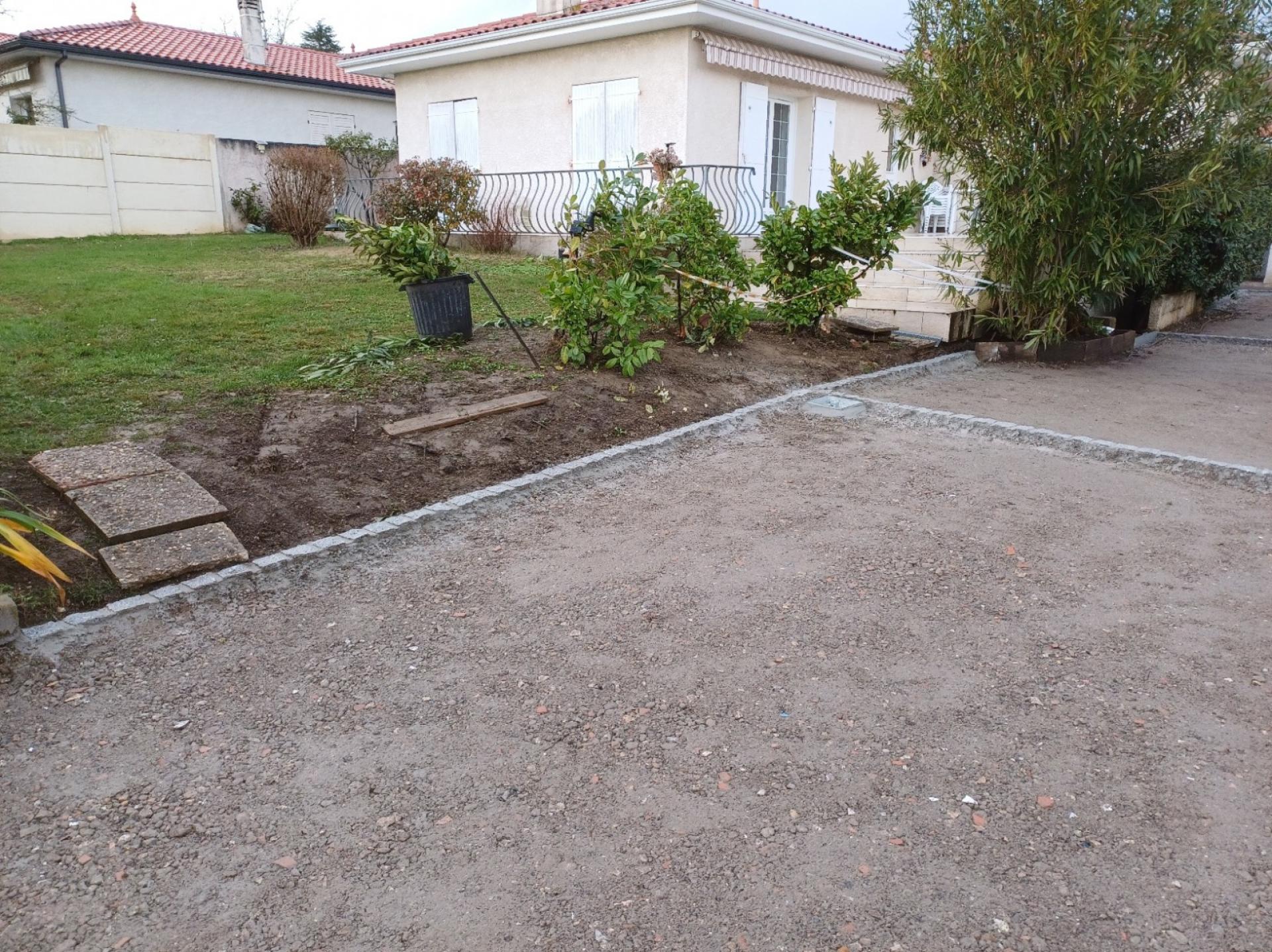 TTL33 a effectué des travaux d'aménagement extérieurs, avec ici la création de chemins en béton désactivé avec bordures en pavés granit Alba à Saucats.