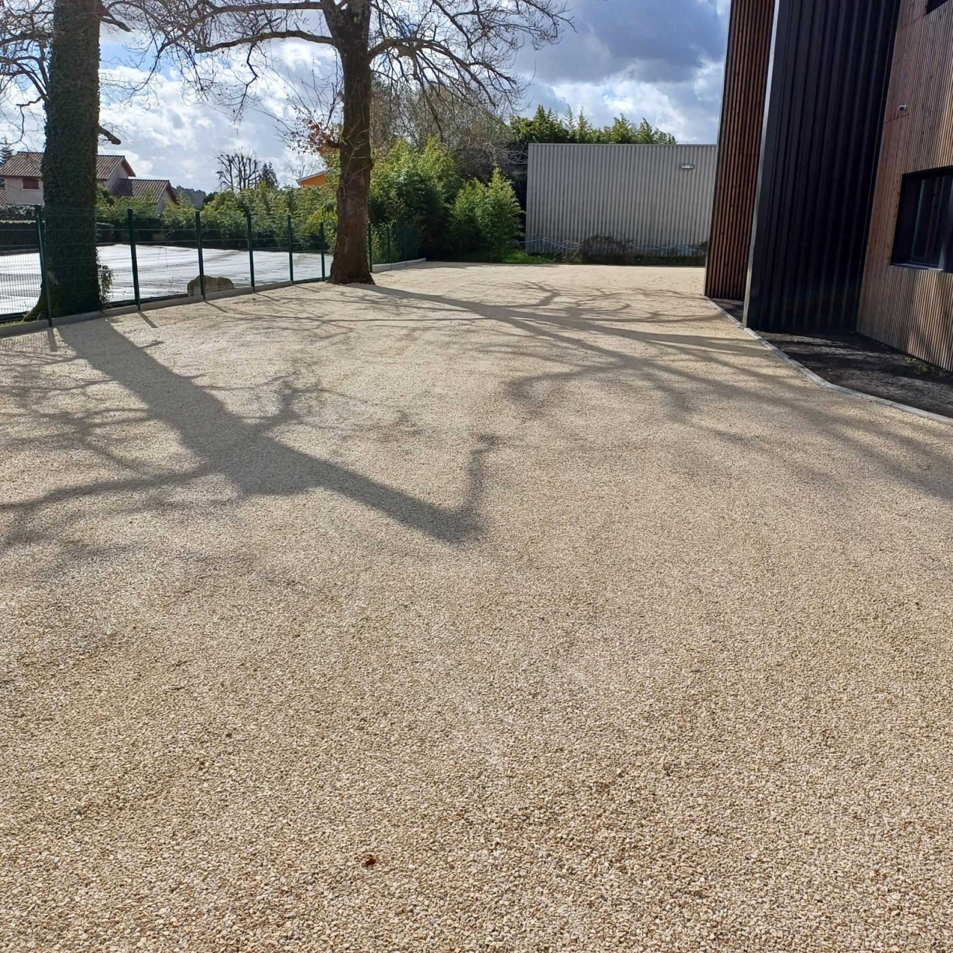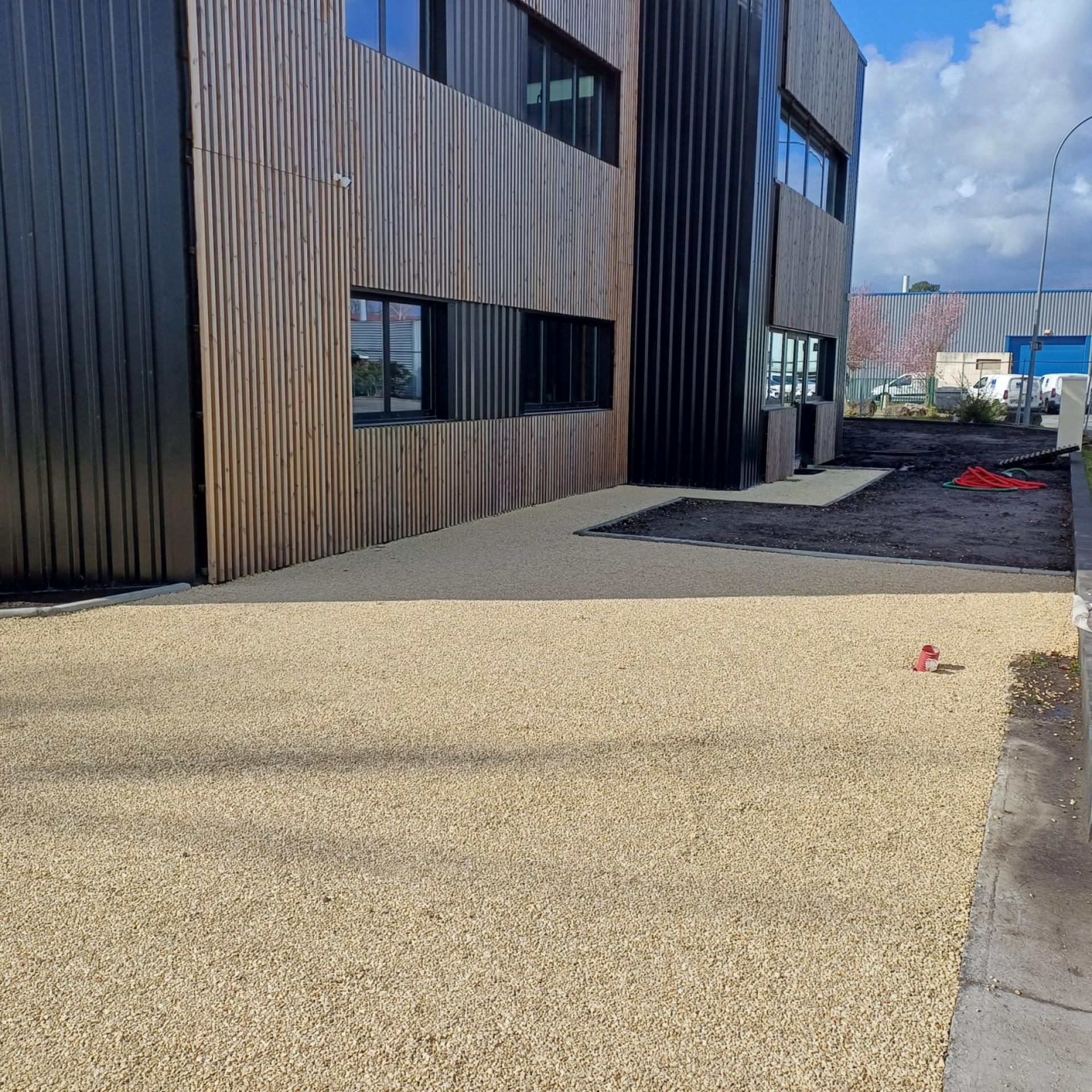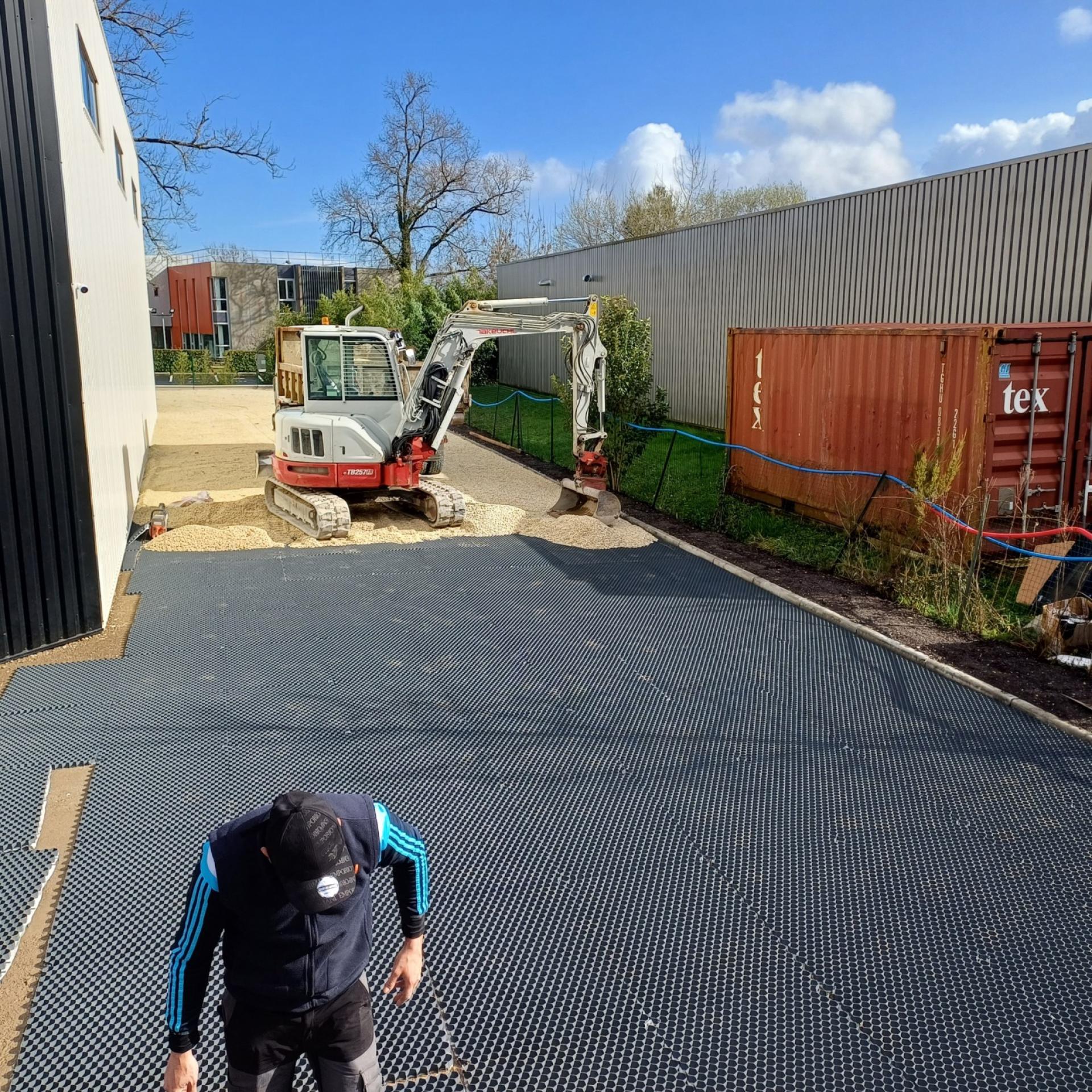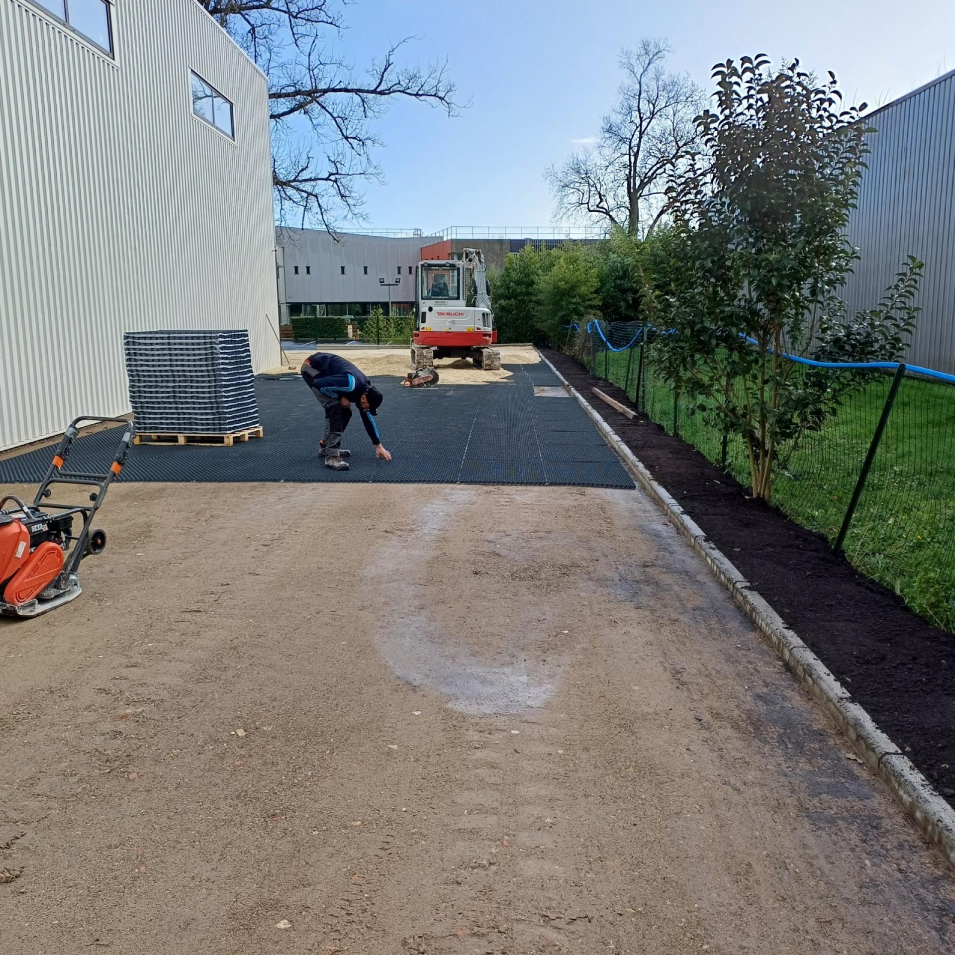 La pose de 780 m² de plaques alvéolées a permis de stabiliser le sol tout en optimisant la gestion des eaux. Enfin, des bordures P1 ont délimité l’espace parking des zones végétales, avec un dernier transport et mise en place de terres végétales pour une finition soignée.