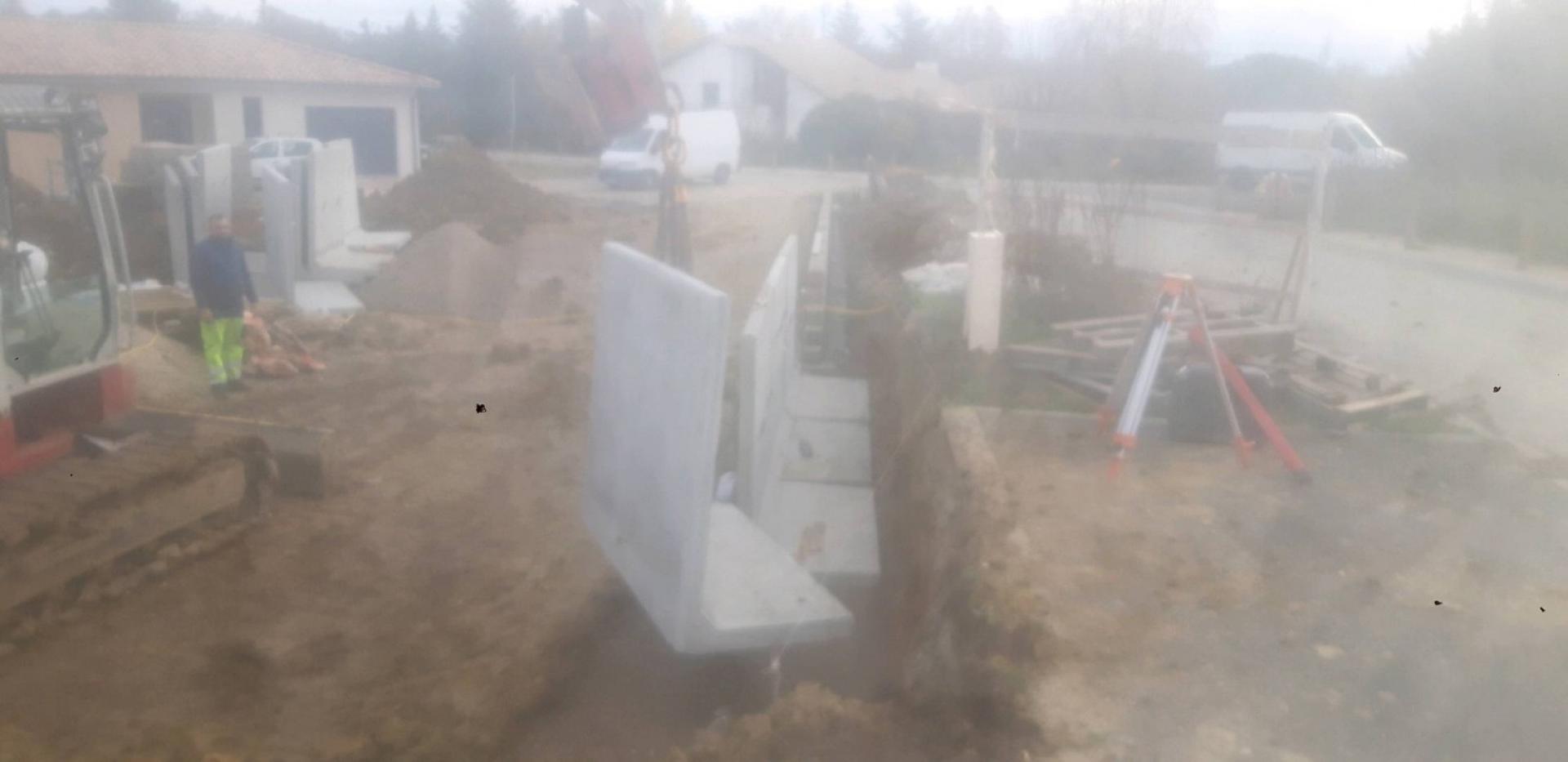 Création d'un mur de soutiennement en L béton préfabriqué en 2 m par 1,70 de hauteur sur une longueur de 30 m pour retenir le talus de terre chez un particulier il y a eu l'implantation le terrassement la préparation la mise en place d'un béton concassé en fond de forme et la mise en place de tous les L béton préfabriqué il y a eu la pose d'un drain diamètre 100 sur l'arrière du L béton la mise en place d'un caillou roulé 15-25 sur une hauteur de 1 m 50 et une largeur de 60 cm et raccordement du du drain sur le puisard de la maison il y a eu le transport et la mise en place de terre végétale sur l'arrière L béton préfabriqué.